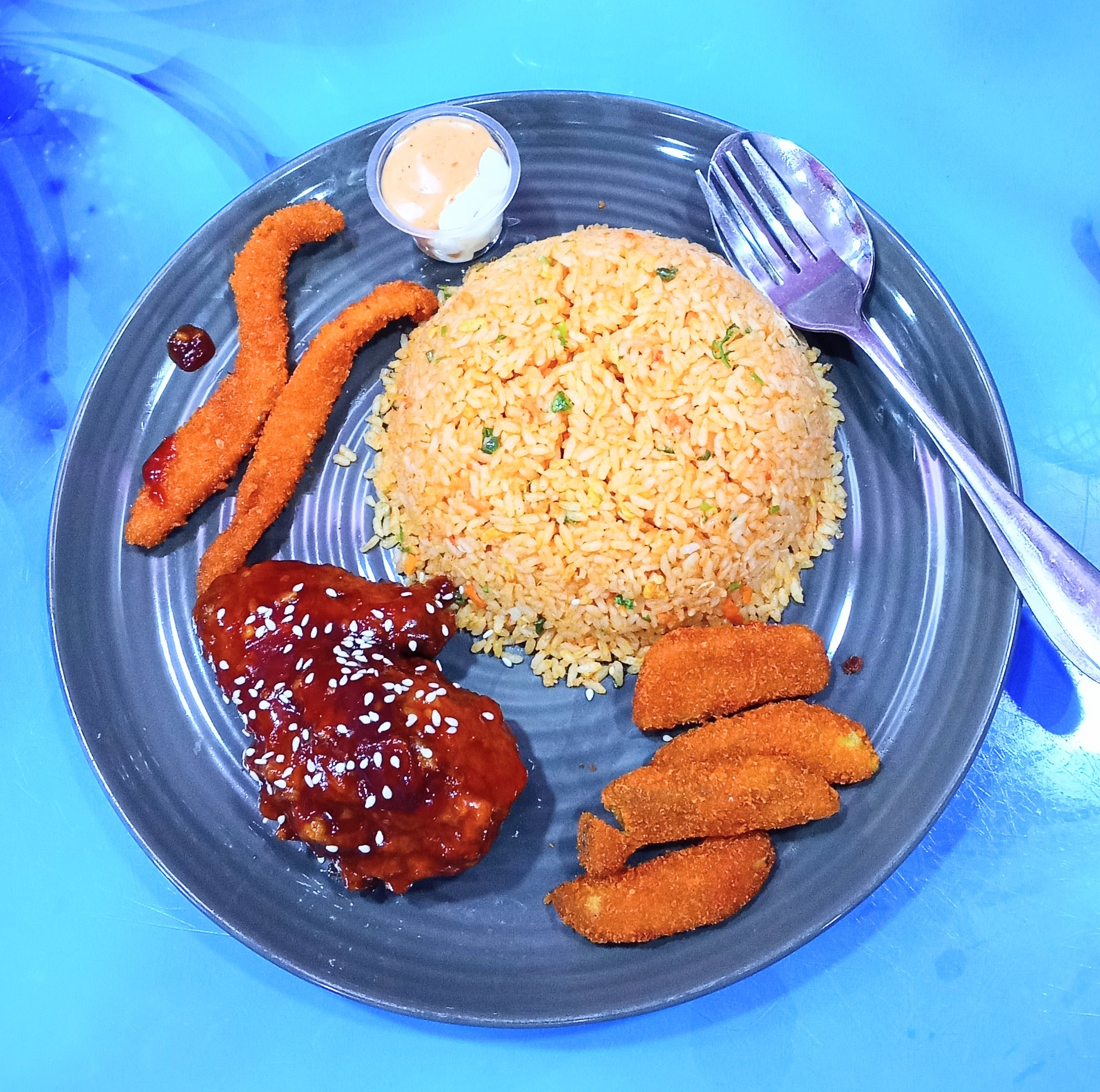 Mexican Rice, BBQ Chicken, Chicken Milanese, Wedges